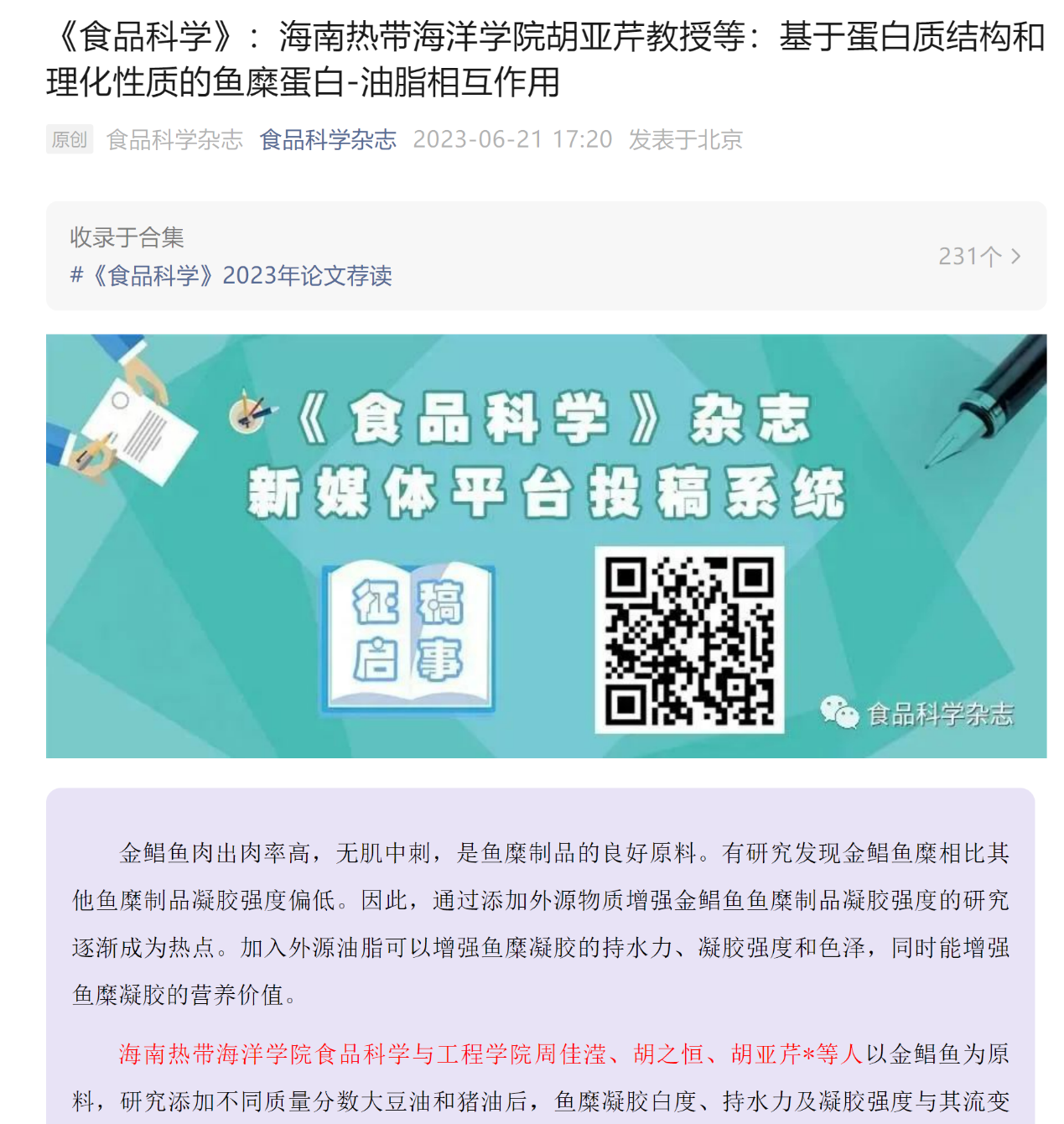 公司伟德国际victor1946教授胡亚芹团队最新研究成果“基于蛋白质结构和理化性质的鱼糜蛋白-油脂相互作用”被国内食品领域顶级中文期刊《食品科学》录用。鉴于论文研究结果为同行评审高度认可,《食品科学》杂志作为热点文章在其官微上公开发文荐读。