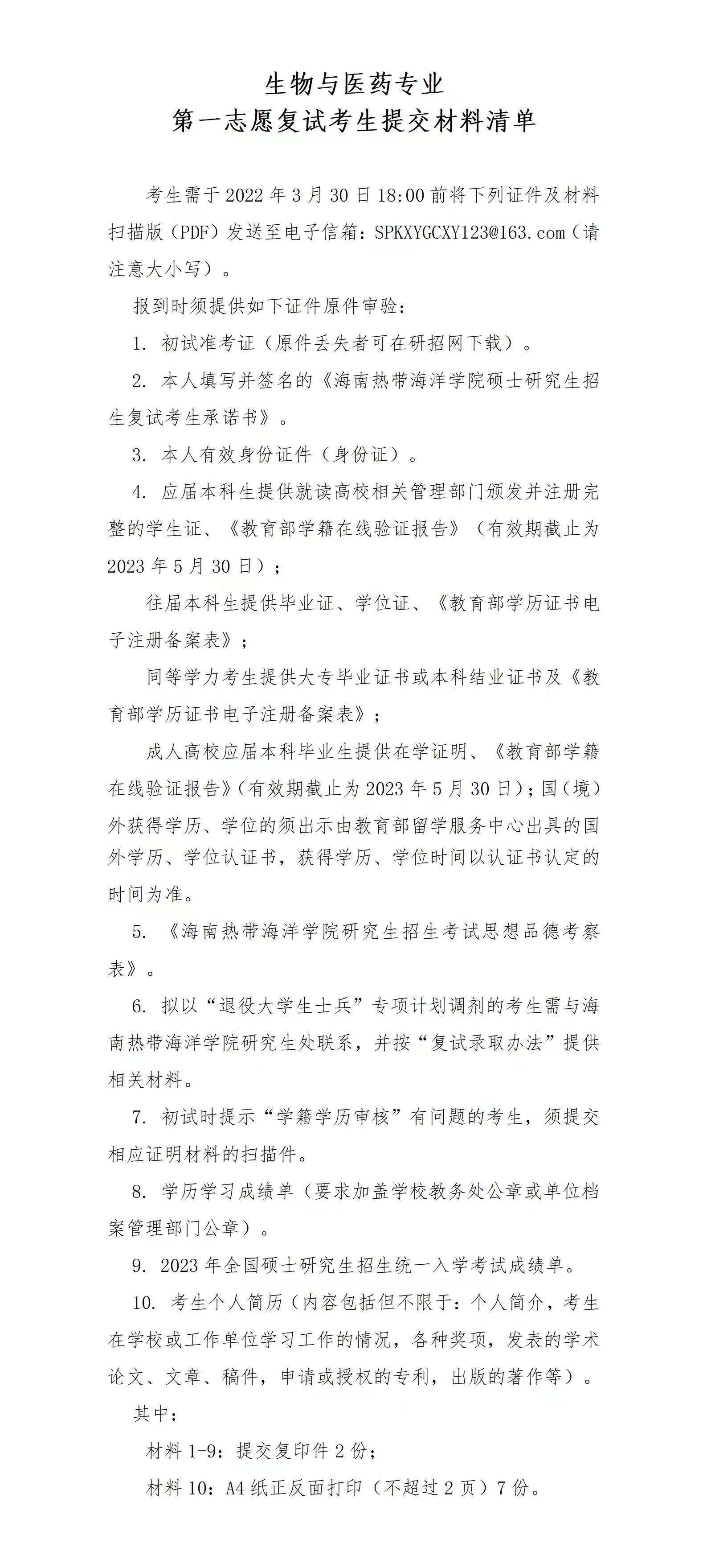 生物与医药专业一志愿考生复试提交材料清单